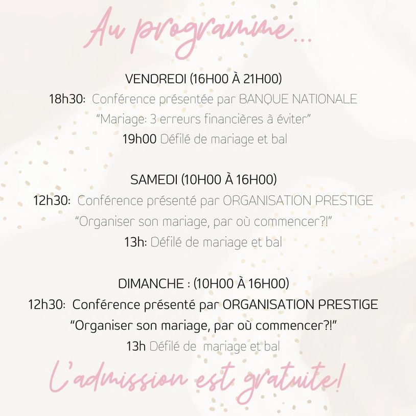 Nous serons très heureuses de vous rencontrer et réunir au même endroit, une panoplie d'exposants prêts à vous aider a rendre cette journée si mémorable!